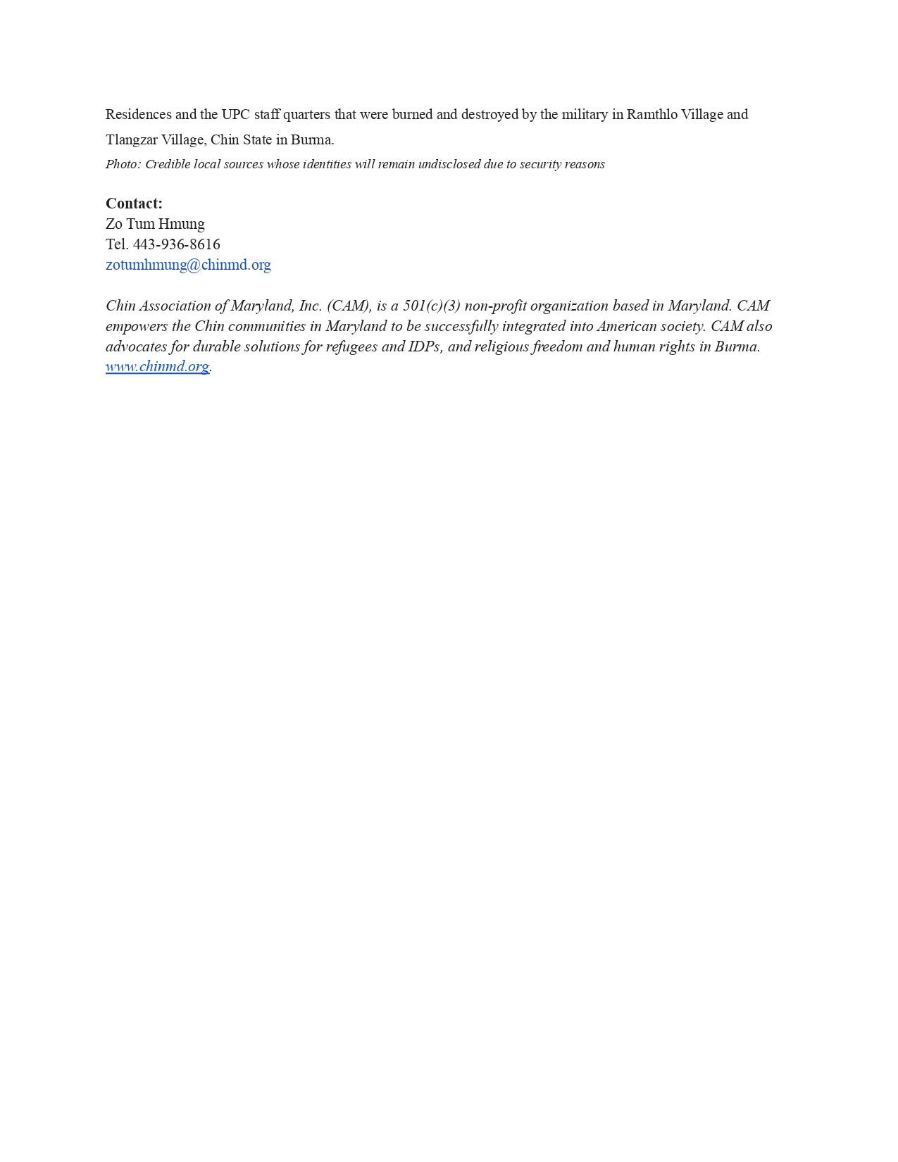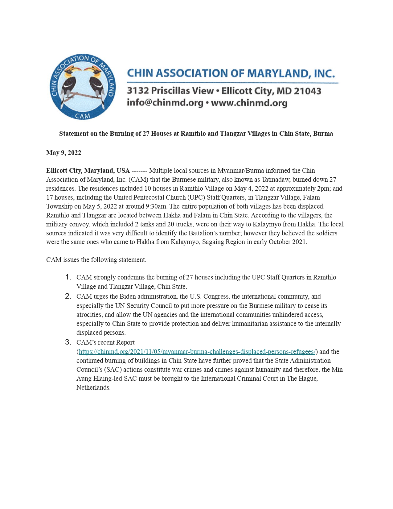 On March 31, 2022, the Tatmadaw in Kanpalet, Chin State fired and destroyed a multipurpose building of the Kanpalet Township Baptist Association in Kanpalet town. The military also destroyed the Association’s Van Ambulance. The Chin Association of Maryland, Inc. (CAM) will not disclose information regarding the sources due to security reasons.