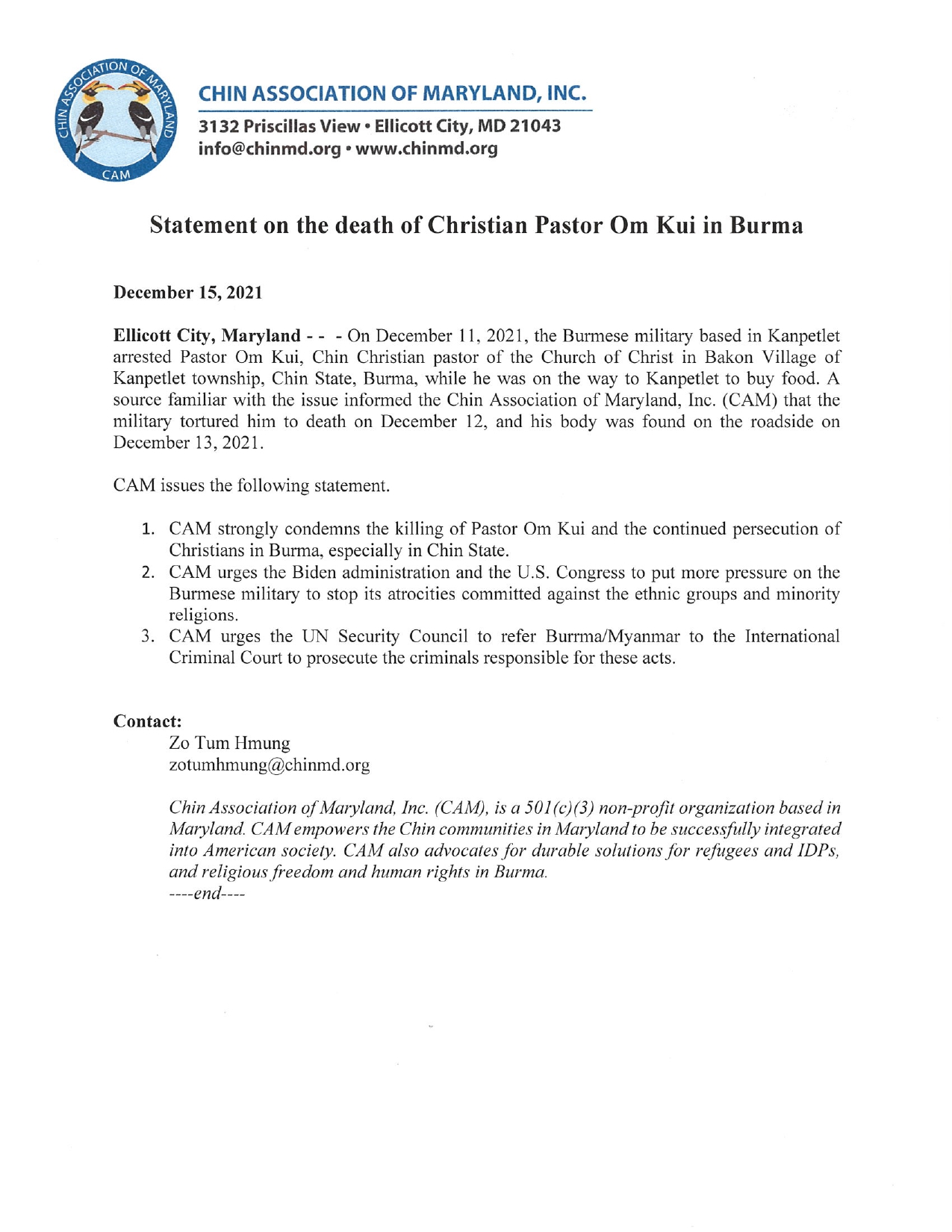 Chin Association of Maryland, Inc. (CAM) is grateful to Chin churches in the United States for their financial support for the writing and publishing of Unprotected: Chin IDPs in Chin and Rakhine States in Myanmar/ Burma. Without their support, this would not have been possible. We are indebted to Chin community members in Chin State and Rakhine State who conducted the in-depth assessment on the ground. We thank you to Jenny Siegel, a Ph.D student, who is a CAM Consultant for this report. She compiled and edited the report, including background information and also assessment information. CAM is also grateful to Steven Ruben who selected photos for the report, and to Matthew Wilch who provided advice to Zo Tum Hmung, Executive Director, CAM.