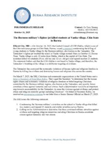 Ellicott City, MD —-On October 14, 2025, the Central Council of CDF-Hakha, which is one of the Chin resistance groups in Chin State, Burma, issued a statement condemning the killing of young students in Vanha village by the Burmese military, also known as the Tatmadaw. The Tatmadaw’s fighter jet bombed the school at Vanha village around 10am on October 13, Burma Time. Vanha village is only 22 miles from Hakha, which is the capital of Chin State. The airstrikes killed two students (8 yrs. old boy and 12 yrs. old girl) and injured another 21 students. The statement further said that the CDF-Hakha is not based in Vanha village, and therefore, the Tatmadaw’s bombing of the village is a deliberate targeting of civilians.